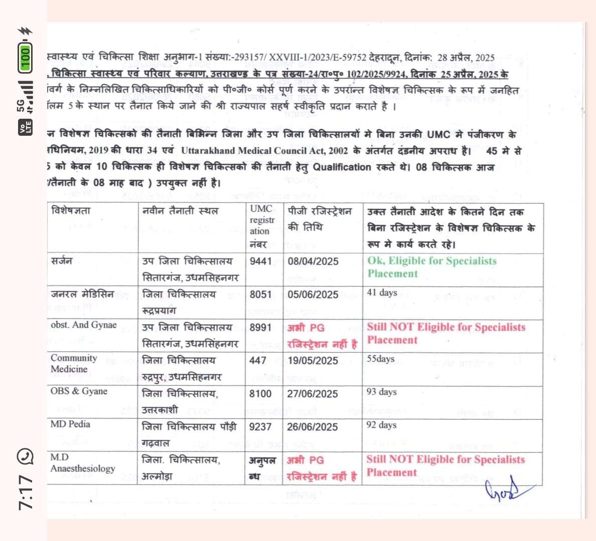 28 अप्रैल 2025 को स्वास्थ्य विभाग ने 45 विशेषज्ञ डॉक्टरों की अस्थायी तैनाती का आदेश जारी किया।