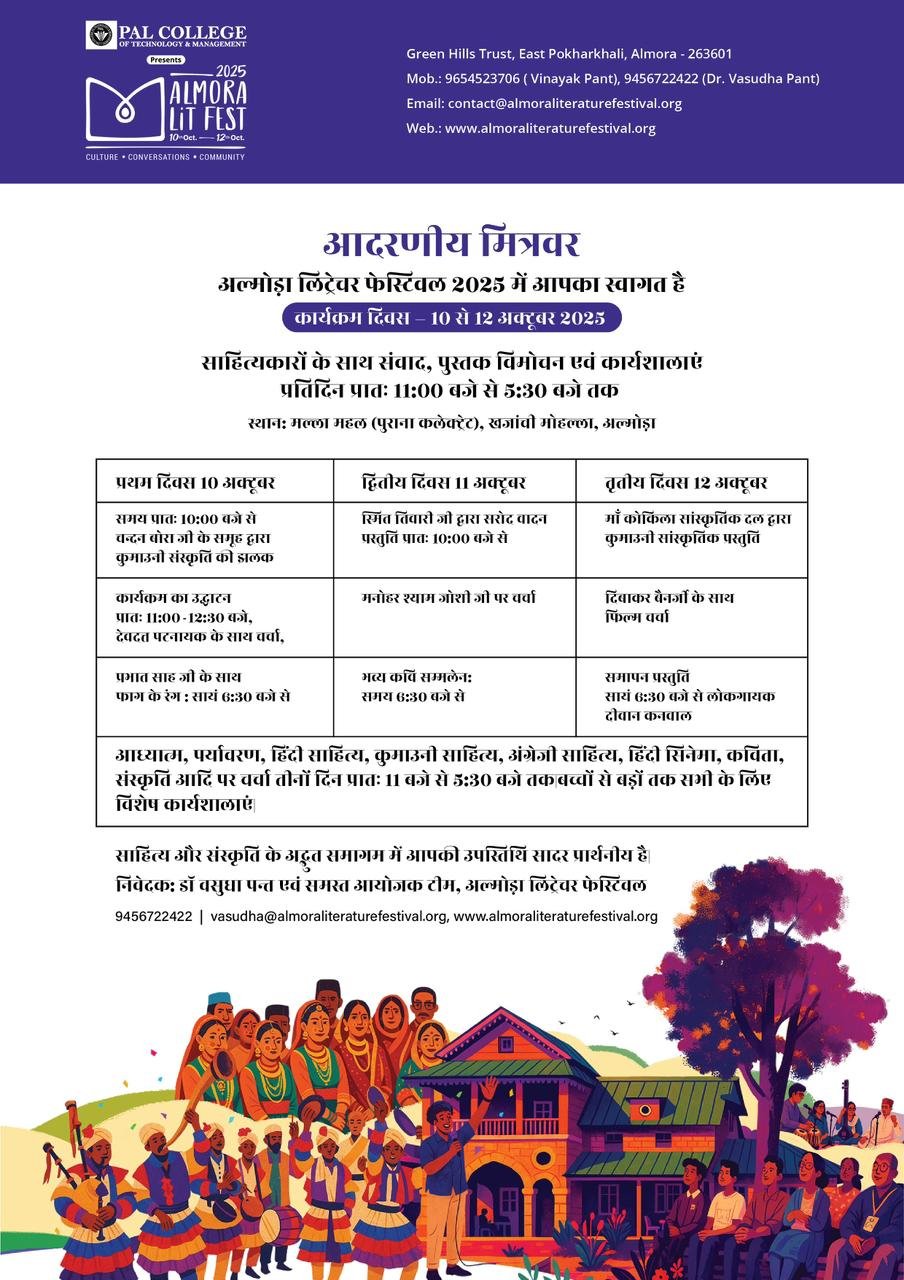 अल्मोड़ा लिट्रेचर फेस्टिवल 2025 : 10 से 12 अक्टूबर तक, पाल कॉलेज मुख्य प्रायोजक के रूप में