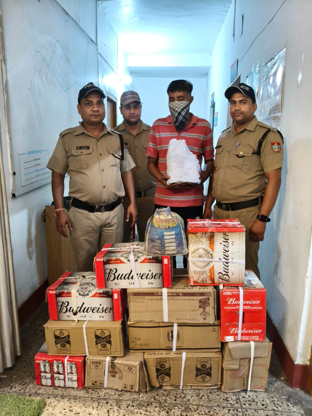 कुल 11 पेटी (66 पव्वे मैकडेवल व्हिस्की ,44 पव्वे 8 pm व्हिस्की , 24 बोतल Budweiser बीयर ,72 केन Budweiser बीयर, 19 हाफ मकडेवल विस्की, 33 पव्वे बकाडी लेमन रम ,37 पव्वे रॉयल स्टैग व्हिस्की, 12 बोतल कॅप्टन मॉर्गन रम)