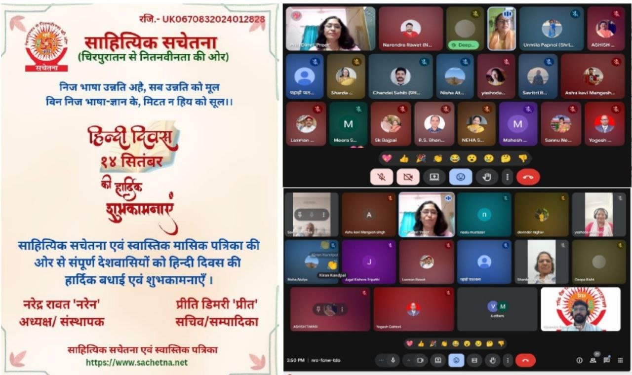 साहित्यिक सचेतना एवं स्वास्तिक मासिक पत्रिका द्वारा रविवार 14 सितंबर 2025 को हिंदी दिवस पर काव्य गोष्ठी का आयोजन किया गया। काव्य गोष्ठी का शुभारंभ सरस्वती वंदना के द्वारा प्रारंभ हुआ। दीपा नेगी बिष्ट ‘दीप्ता’ जी द्वारा सरस्वती वंदना प्रस्तुत की गई। सभा का प्रारंभ गुरुदेव नरेंद्र रावत ‘नरेन’ जी के उद्बोधन से शुरू हुआ। इसके पश्चात सभी रचनाकारों ने अपनी काव्य प्रस्तुतियां प्रस्तुत की। हिंदी गोष्ठी में राय सिंह भंडारी जी, मंगेश सिंह जी, उर्मिला पपनोई ‘श्रीजा” जी, जुगल किशोर त्रिपाठी जी, मीरा मोहन जी, आशीष तिवारी जी, विजय सजवाण जी, चंदेल साहिब जी, दीपा नेगी बिष्ट जी, नीरजा मेहता ‘कमलिनी’ जी, निशा अतुल्य जी, शारदा ओझा जी, नीलू मुस्ताजर जी, सन्नू नेगी जी, राम सिंह भंडारी जी, नेहा शर्मा ‘नेह’ जी, डॉक्टर श्वेत केतु शर्मा जी, यशोदा मैथानी ‘चेतना’ जी, योगेश गहतोड़ी जी, किरण कांडपाल जी, सावित्री भारतीय जी, घनश्याम अग्रवाल जी, श्रवण कुमार बाजपेई जी, जयश्री सिंघल जी, शारदा कनोरिया जी एवं विजयश्री जी उपस्थित रहे।