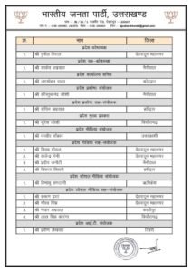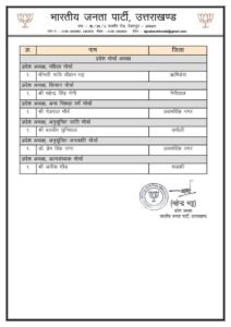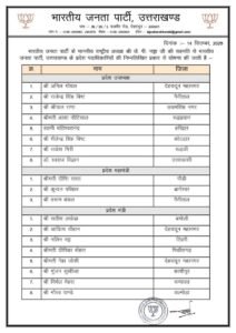 भाजपा ने उत्तराखंड संगठन की नई टीम का ऐलान कर दिया है। पार्टी ने प्रदेश पदाधिकारियों की लिस्ट जारी करते हुए कुल 42 नेताओं को जिम्मेदारी सौंपी है। खास बात यह रही कि इस बार 17 नए चेहरे संगठन में जगह बनाने में कामयाब रहे, जबकि पहली बार पांच महिलाओं को अहम जिम्मेदारियां दी गई हैं।बीजेपी की नई टीम में अनिल गोयल, राजेन्द्र सिंह बिष्ट और श्रीपाल राणा समेत आठ नेताओं को प्रदेश उपाध्यक्ष नियुक्त किया गया है। वहीं, दीप्ति रावत, कुन्दन परीहार और तरुण बंसल को प्रदेश महामंत्री की जिम्मेदारी सौंपी गई है। वहीं सतिश लखेडा, आदित्य चौहान, नलिन भट्ट और दीपिका बोहरा को प्रदेश मंत्री बनाया गया है। अनुसूचित जाति मोर्चा के अध्यक्ष बलवीर घुनीयाल और अनुसूचित जनजाति मोर्चा के अध्यक्ष डॉ. प्रेम सिंह राणा बनाए गया है।इसके अलावा वित्तीय प्रबंधन के लिए पुनीत मित्तल को प्रदेश कोषाध्यक्ष और साकेत अग्रवाल को सह-कोषाध्यक्ष नियुक्त किया गया है। वरिष्ठ नेता सुरेश जोशी को प्रदेश मुख्य प्रवक्ता बनाया गया है, जबकि मनवीर चौहान को मीडिया संयोजक की जिम्मेदारी मिली है। महिला मोर्चा की कमान रुचि चौहान भट्ट को सौंपी गई है। वहीं, किसान मोर्चा का नेतृत्व अब महेन्द्र सिंह नेगी करेंगे।